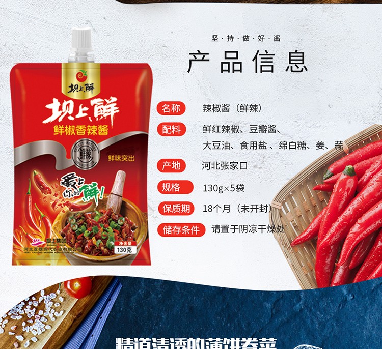 坝上鲜鲜椒酱取之优等坝上鲜辣椒,经过淘洗、精炼、