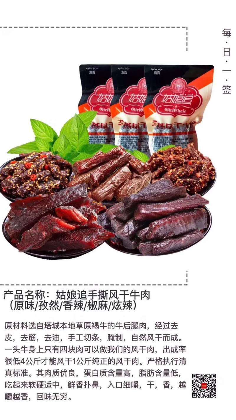 “姑娘追”取自哈萨克青年最喜爱的一种马上体育游戏“姑娘追”,哈萨克语称“克孜库瓦尔”。而手撕风干牛肉是以塔城盆地牧民放养的牛羊肉为原料,生产的各种肉制品全部采用天然植物香料,自然烘干,其特点是入口疏松化渣、口感舒适、回味绵长、风味独特,让人有回归大自然的感觉。